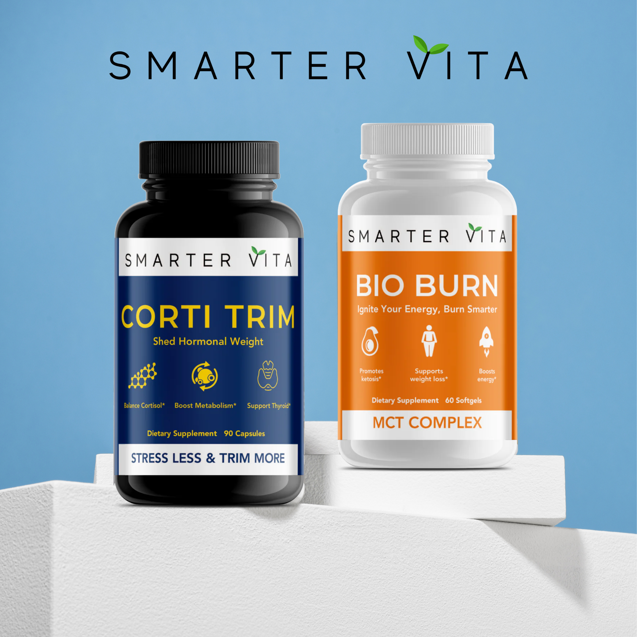 CortiTrim reduces cortisol, the stress hormone responsible for belly fat, and supports your metabolism by optimizing thyroid function. BioBurn, powered by MCT oil, fuels your body with clean energy and encourages your system to burn fat as fuel. Together, they provide a comprehensive solution to burn fat, conquer stress, and boost energy.